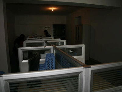 新的临时办公地点坐落于中山路亚太名苑602房——一间还未交付使用的毛坯房。推开厚重的房门,拼接在水泥地上的灰色地毯映入眼帘。比起原来的办公室,粗壮结实的水泥梁柱说明这里的安全系数的确高了很多。墙上的乳胶漆还未渗干,嗅着散发潮湿油漆味的空气,看着阳光照射下灰尘飘散的房间,听着刺耳的装修噪音,这就是筹备中的兰州新东方学校的新家。