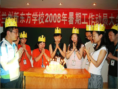 兰州新东方学校筹建至今,由于时间紧,任务重,工作强度大,很多员工都忘记了自己的生日。在暑期动员大会上,校办和人力资源部也为从参与兰州新东方创建之初到今天为学校奋斗做出积极努力的10位员工集体补过生日。戴着生日帽的他们在蛋糕上插下了一根根闪耀着耀眼光芒的蜡烛,再次许下自己心中美好的愿望。