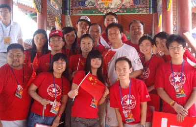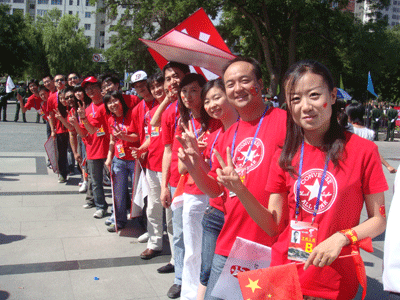 火红的T恤,硕大的标语牌,精致的纸贴,招展的彩旗……我们正在迎接百年一遇的盛典。