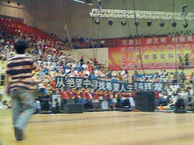 18:30,兰州新东方学校22名员工身着统一服装来到兰州体育馆。兰州新东方学校的红色方阵在体育馆内格外显眼。员工们手持新东方“从绝望中寻找希望”的校训宣传牌吸引的不仅仅是场内观众的目光,也吸引了当晚众多实力派歌手的注意力。当著名歌手金海心爱心献唱后,看到了新东方校训,大声地念着“从绝望中寻找希望,人生终将辉煌”,随后询问我们是哪家单位,当得知我们是“新东方”后,对我们的爱心捐赠表示感谢,同时感叹新东方的校训说的非常好,应该用这句话来鼓励受灾地区的民众从绝望中寻找希望,重建美好家园。