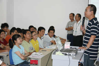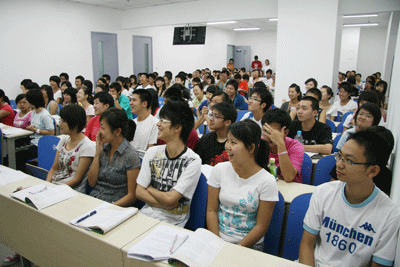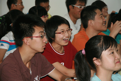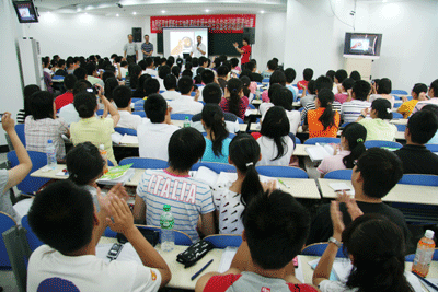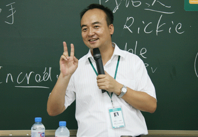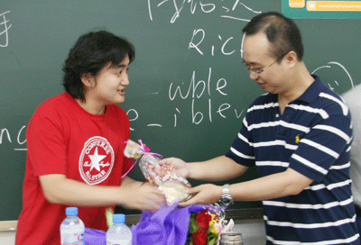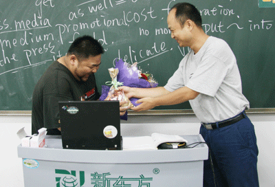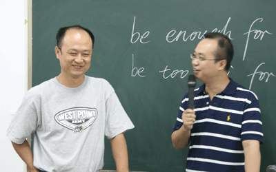当身高、身材、发型都酷似的屈建民老师和孔建龙老师站在一起时,邓弘老师调侃地说道:“新东方TWINS向大家表示亲切的慰问!”,学员们立刻被逗得前仰后合,而后,邓弘老师幽默的话语如连珠炮般轰的在场的师生笑的前仰后合。邓弘老师多才多艺,讲到极致,又一展歌喉,一曲小虎队的《爱》赢得了学员们的阵阵叫好。