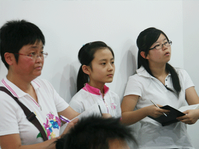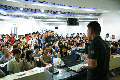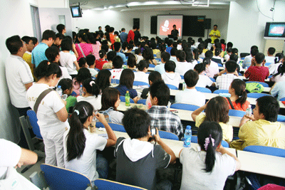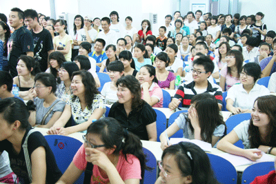 面对热烈的掌声,许老师谦虚而不失稳重,时尚的装扮拉近了与学生们的距离,深厚的英语功底使在座的许多英语专业的家长们也不得不叹服。许老师以新概念英语为切入点,从WHY、WHAT、HOW等三个方面,阐述了英语中词汇、逻辑、语法以及文化的相互关系和研习方法。在讲解单词的记忆方法时,许老师告诉学生们,记忆单词要精选、巧记、活用;讲语法时,他告诫学生们:语法不仅为了应对考试的,更重要的是学以致用。他旁征博引,巧妙举例,幽默传递,让大家在领略名师思想闪光的同时,扑捉到了学习英语的奥秘与真谛。同学们记笔记、答问题、共商讨,教室里笑声连连,掌声不断,空调虽然开到了最大,但求知者的热度却高居不下,并且随着许顺康老师课程的深入而不断升温。