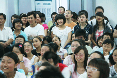 之前进行的几场兰州新东方公开课的火爆登场,进一步催化了广大金城学子和家长的学习热情,追捧新东方、聆听新东方名师畅谈英语学习之道已经愈演愈烈。当大家再次听说“肩扛假顺治康熙之威、身负新东方培训师之实”的许顺康老师现身兰州后,偌大的302教室在开课前半小时就已经是摩肩接踵、人头窜动。不仅教室里水泄不通,就连三楼的走道也被挤得水泄不通。