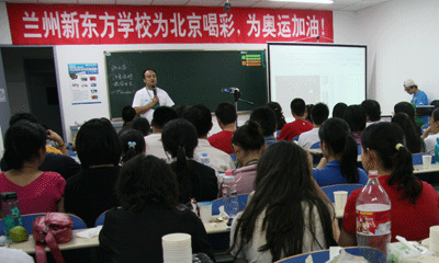 2008年8月8日,兰州新东方学校总部301教室。火红的横幅,硕大的投影幕,新鲜的水果,喷香的干炒,冰凉的饮料,还有欢快的笑声,雷鸣般的掌声……在我们自己精心营造的主场,兰州新东方全体员工为北京喝彩,为奥运加油!