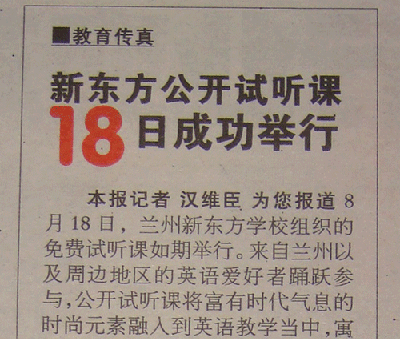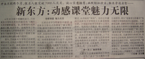 兰州新东方学校已迈着矫健的步伐,在热烈而繁忙的教学氛围中走过了56天。在暑期报名人数突破6000,总报名人数突破7000之际,兰州各大媒体都对新东方做了报道。