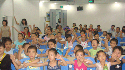 在互动环节,首先是老师与学生们共同参与的猜词游戏。一时间台下群情激动,小家伙们纷纷举手,争相参加。台上,学员们与老师们心灵相通,默契配合,在一分钟的时间里,猜词纪录屡屡被刷新。
