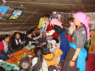 走进帐篷,好客的主人给每个人献上一条洁白的哈达,捧上一碗香喷喷的酥油奶茶,敬上三杯草原人最爱喝的青稞美酒,以表达他们对远方客人的深深敬意。走出帐篷,举目远望,眼前是蓝天、白云和蔚蓝色的湖水,交相辉映,山水相连,茫茫无际。这是大自然绘就的一幅美丽迷人的草原油画,绚丽多彩,婀娜多姿,让人看了流连忘返。