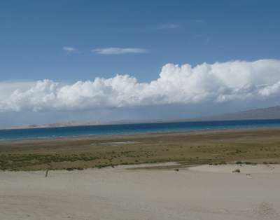 驶出原子城,我们很快来到了金沙湾。而不远处,一大块“蓝宝石”镶嵌于地平线之上,那就是青海湖,大的像海,蓝的出奇。在金沙湾的山脚下,不时地看到星星点点的黑色和白色的帐篷。在依稀翠绿的草原和远山上,一群群散开的牛羊在斑驳的绿色地毯上悠闲地散步,厚厚的云彩近的伸伸手似乎就能够摸到,淡定的看着云朵静静飘过,云卷云舒,心胸顿然开朗。这样的景色不由使人想起了徐志摩的诗:“悄悄地我走了,正如我悄悄地来,我挥一挥衣袖,不带走一片云彩。”而此时,我却想贪婪的将这满天的云彩装进衣袖,全部带走。如此美景,众人岂能错过。迎着风,靠着云,大家纷纷合影留念。看到这片绿的让人心醉的草原,回头瞥见那片蓝的让人心碎的湖水,感叹天地竟能幻化出这样的美景。