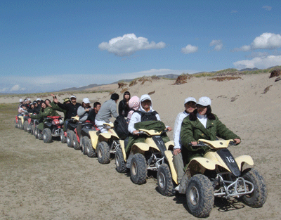 从金沙湾通往青海湖的路与众不同,黄沙与绿草交错,必须骑上沙滩摩托才能到达。大家纷纷选择自己的坐骑,伴随着轰鸣的摩托声和心中的澎湃,穿越辽阔的草原,激起飞扬的黄沙,风驰电掣般奔向心驰神往的青海湖。当驻足湖边时,醉了。