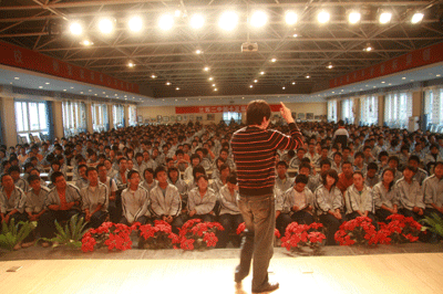 接下来,被誉为“新东方赵本山”的考试部杨村老师走上了讲台,他的讲座内容分为三个方面:首先,在一定的时间内,钻精钻透一本英语教材;第二,英语学习是一个漫长而艰苦的过程,只有坚持才能取得成功;第三,只有量的积累,才会实现质的突破,这就是英语学习“质、量互变规律”。杨老师的举手投足和一言一句个性鲜明、诙谐洒脱令整个现场充满了轻松的幽默和快乐气氛。