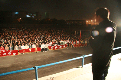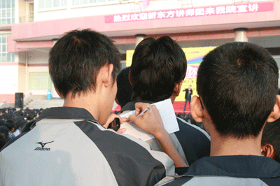 孔老师首先讲解了单词的记忆方法,幽默的语言,捧腹的笑料,精辟的总结,使学生们在欢笑声中感受着新东方老师的魅力,将知识化于欢笑中的魔力。随后,孔老师与学生们分享了自己的经历,描绘了生活在社会底层的民工的生活,告诉他们出生不可以选择,但人生可以通过自己努力去改变。与台下不少来自农村的学子内心产生了共鸣,孔老师讲得动情之时,眼眶湿润,不少学子感动了,用衣袖拭去留下的泪水。演讲结束之时,伴随着音乐,孔老师由念起了那首感动无数人,激励无数人的《我变态,我疯狂,我成功,所以我魅力无穷》的文章。新生们深受震撼,当音乐声静之时,有的学生泪流满面,有的学生头深深埋藏,几乎所有的人噙着着泪水,用力的鼓掌。