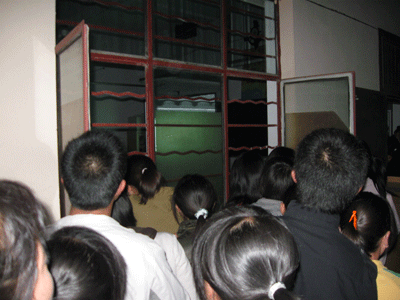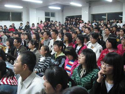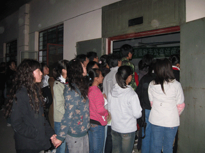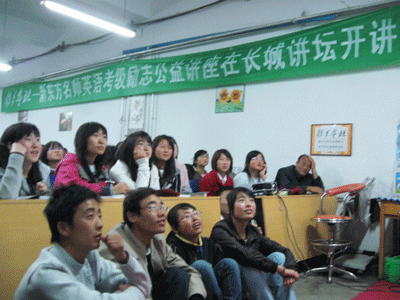 本来只是一场针对四级考试的小型专题讲座,但场面却令兰州新东方的老师们倍受感动和震撼。教室不大,固定位子早已座无虚席。走道里全是加座,教室最后紧贴着墙面也垒起了一道厚厚的人墙。除了给讲座老师脚下留出了一尺见方的空间外,教室里再也没有地方了,门口更是被围的水泄不通。为了听讲座,一部分同学紧紧地趴着窗户栏杆,后来的则贴在前面人的肩膀和脊背上。就这样,每扇窗户前都是一层落一层,凡是能够看见讲座老师身影的缝隙都被同学们的脑袋填满了。