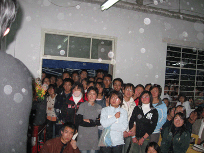 一阵风过后,天空开始下雨,而且越下越大,气温和先前预报的一样骤降至零度左右。这丝毫没有影响到大家庭听讲座的热情。学生会的同学们找来了两个防雨棚,搭在教室门口。此时,还有不少人加入进来,却没有一个离开。很快,雨棚下面连落脚的地方也没有了。在风雨里,同学们时而低头凝想,时而开心地大笑,时而和里面的人群一起鼓掌叫好。