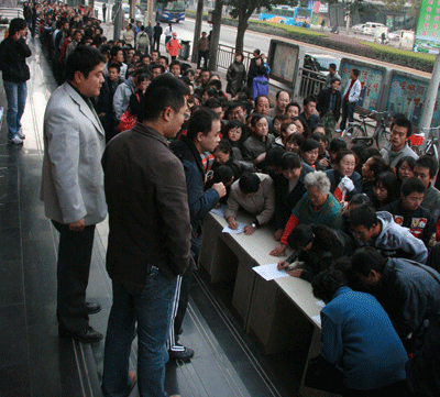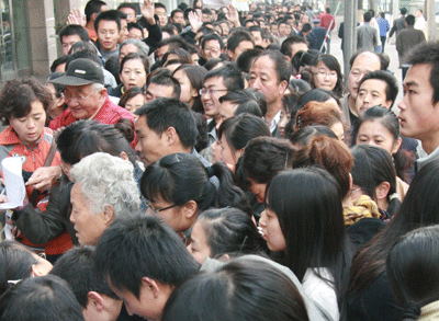 人越来越多,队伍向前越拥越快,整个赠书台有被人群包围的趋势。出于安全考虑,工作人员将队伍一分为三,并用人墙在三列队伍之间拉起了两道安全隔离线,在保证了赠书活动秩序的同时,也加快了发放速度。第一阶段1000本《挣脱生命的束缚》在半个多小时便被热情的兰州市民一抢而空。然而,还不断有得到消息的兰州市民匆匆赶来,面对大家的焦急和失落,工作人员立即拿出预备好的《新东方精神》06年合订本来满足大家的需求。