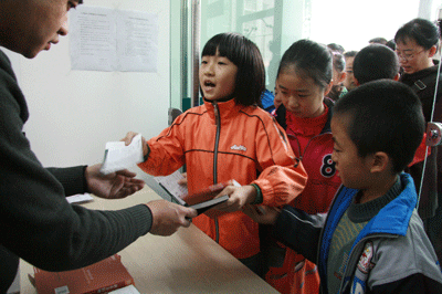 9:00整,伴随着“没有什么能够阻挡,我对自由的向往……” 的熟悉曲调,赠书活动正式开始,先前平静的队伍开始喧闹起来,多时的等候让众人已经按捺不住自己的情绪,队伍迅速向前移动着。领到书的人如获至宝,摩挲着封面,迫不及待的翻看。排在后边的人催促着前面的人加快速度,还不时地伸长脖子往前探,急切心情可见一斑。