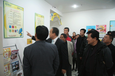 在各个教学区,刁玉柱局长等仔细了解了教室设施和相关硬件设备的配备情况,并认真地询问了招生、师资和课程体系建设等问题。当参观团一行走进缤纷多彩的POP少儿教室时,大家不禁眼前一亮,纷纷饶有兴致地拿起手中的相机拍摄下了每一处精美的环创。