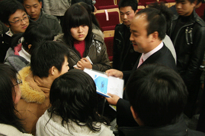 在“如何做职业发展规划”这个话题中,刘文忠老师又详细分析了职业发展中可能遇到的困惑以及进入职场的一些准备,他说:“角色定位、适应化境、勤奋吃苦、发挥专业技能、人际沟通协作和把握‘度’的主动积极性这六个方面是能在一个企业立足并获得长足发展的基本要素,只有不断去完善自己,才能有机会达到你心中的梦想。”通过对就业前景的分析,刘老师讲解了目前市场所需的人才类型和就业者个人应具备的素质。刘老师认为,善于发现自己优势的人是最有可能面试成功的。刘老师还特别强调了“终生学习”的概念,他强调不停地提升自己充实自己,绝对是一个成功者的必要条件。
