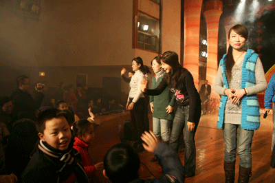 联谊会上,好戏接连上演,高潮此起彼伏。英文剧《狼和小羊》、《龟兔赛跑》之后,主持人与现场的小学员玩起了猜谜语的游戏,小学员们奋勇争先,冲到了舞台前,全场气氛达到了高潮。