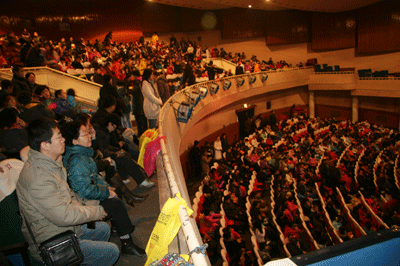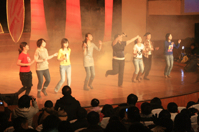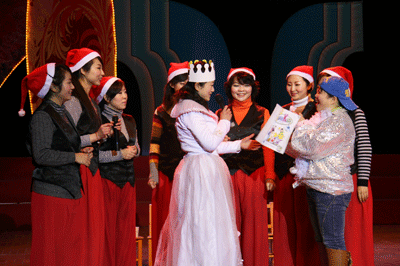 .gif) 少儿老师们自编自拍的《白雪公主》在梦幻的舞台效果衬托下显得亦真亦幻,跌宕起伏的情节,老师们炫动的演出紧紧抓住了观众和POP小学员们的眼睛,他们始终挥舞着手中的响板,配以高分贝的掌声、欢呼声,让现场气氛跌宕起伏,高潮不断。家长纷纷感慨兰州新东方真是“群星璀璨”,“藏龙卧虎”。
