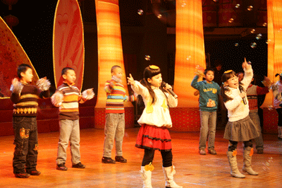 .gif) 晚会开始前20分钟,剧场的大投影幕上首先播放了MV短片《我们的兰州新东方》和《POP少儿大事记》。短片回顾了兰州新东方以及泡泡少儿英语部自2008年2月14日创建团队落地以来半年多发展过程中的感人片断和取得的瞩目成绩。