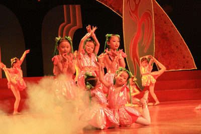 .gif) 徐科老师指导的歌伴舞《哆来咪》气息清新,两位小姑娘的演唱水准不亚于专业,伴舞的小男孩十分卖力,赢得台下小观众惊声尖叫;COCO老师指导的童话剧《丑小鸭》的演员们都是4岁左右的孩子,富有创意的故事结构、恰到好处的音乐剪辑,炫目多彩的服装,小演员们尽心尽力的表演博得了满堂彩,叫好声一片。邹忆、朱蓉老师指导的《拉丁舞》让人眼前一亮,两位小演员曾代表甘肃省参加全国的少儿拉丁舞大赛并取得不俗的成绩。他们的舞姿技惊四座,看他们扭动的腰肢,丰富的面部表情让人忘却了他们的年龄,他们专业的表演令所有人刮目相看,不由自主的鼓掌、叫好。