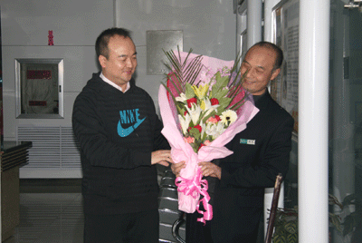 孔校长为春节期间坚守岗位的保洁、保安人员献上鲜花