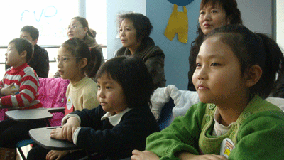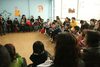 上午10点,示范课首先在兰州新东方学校POP少儿英语教室里进行。参加此次活动的孩子按学龄段被分为三组:1、2年级组,3、4年级组,5、6年级组,分别由老师带领,在不同教室里上课,“金葵花”客户家长陪同观摩。