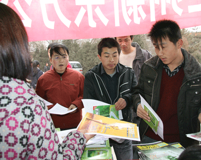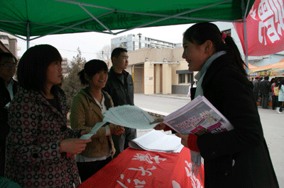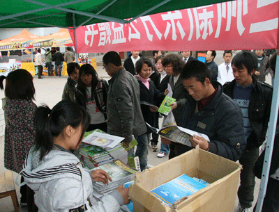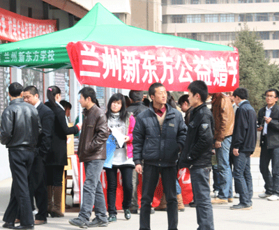 临时赠书点的展棚刚刚搭好,许多同学就纷纷上前围住询问有关学习英语的信息。咨询春季课程的同学和领书的同学交相呼应,一时间整个展台前面人头攒动,被挤得水泄不通。有些同学被是看到身边同学手中拿到的精美期刊和课表所吸引,专门来到赠书展台来领书和了解兰州新东方春季课程的设置,兰州新东方工作人员耐心仔细的向这些同学介绍了兰州新东方的情况和春季课程的设置。杂志赠送完毕后,仍有许多同学不愿离去,围着新东方老师询问学校课程设置和英语学习问题。因为来晚而没有领到期刊的同学十分沮丧,不断询问工作人员什么时间还会举行这样的活动。