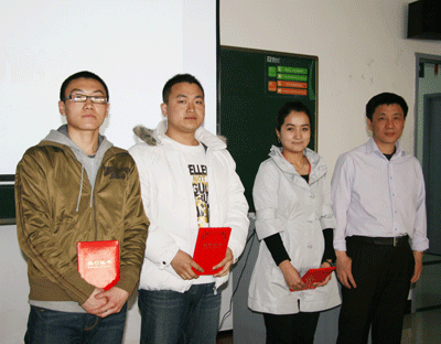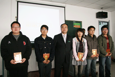 集团公共关系与市场推广部总监贺庆荣老师为2008年度优秀高校联络员颁发了荣誉证书。来自兰州大学、西北师范大学、西北民族大学和兰州交通大学的四名同学获奖。他们平日里工作出色、表现积极,多次协助新东方成功举办各种讲座,并利用自身各种资源,做了大量高校市场调查工作,为兰州学校高校工作的开展起到了积极的作用。
