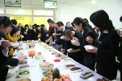 在二楼少儿部门前,兰州新东方学校全体员工为欢迎俞敏洪老师的到来,特别准备了品种丰富、口味各异的“百家饭”。长长的桌子上,摆了上百种饭菜,形状各异的饭盒、长短不一的筷子,显示出了这桌“盛宴”的独特魅力。爆炒蛏子,红烧肉,兰州糟肉,蒜薹炒肉,每一道精美的饭菜都是员工自己亲手所做。上百位同事围在桌子周围,随俞敏洪老师带头走动,大家一起转着圈分享了丰盛的美食。俞敏洪老师对大家表示了真诚的感谢,动情地说,这是自己在新东方吃到的最感动的一顿饭!新东方文化向来有与他人分享的传统,而兰州新东方学校的员工把这种分享的精神做到了极致。