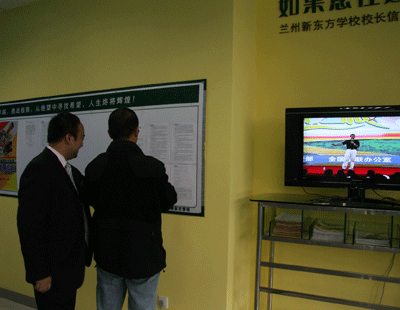 在学校教学区,精心布置的楼道给人耳目一新的感觉,无论是设计巧妙的墙裙,还是墙上挂着的新东方企业文化宣传、世界著名大学的简介,都让人感受到了新东方独特的企业文化魅力和丰富的内涵。兰州新东方学校将教学质量的提高和服务水平的提升纳入学校的发展战略,积极进行优秀人才的引进和一流师资队伍的建设,不断对学校内部环境进行科学规划、合理改造,注意细节、考虑周全,不断对员工进行职业培训,不断提升员工的业务水平,努力打造感动学生的课堂,努力打造感动人心的企业,这些细节之处得到了俞敏洪老师的认可。