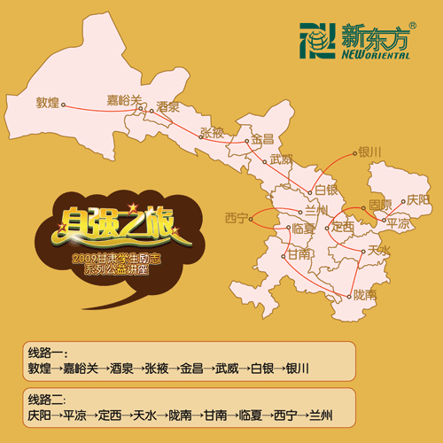 “自强之旅”甘肃学生励志系列公益讲座在5月19日至6月10日分两个阶段进行,第一阶段从敦煌启程,途经嘉峪关、酒泉、张掖、金昌、武威、白银,最后抵达宁夏银川市;第二阶段将从庆阳开始,经由平凉、固原(宁夏)、定西、天水、陇南、甘南、临夏,再转战青海西宁,最后返回兰州,并于6月10日在兰州举办十万人讲座。整个活动将辐射甘肃、青海、宁夏三省,行程5000多公里,涉及到50所大、中学校,200000甘青宁学子将直接感受新东方名师魅力。