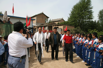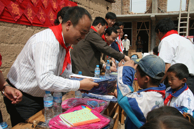 一年来,兰州新东方学校的全体师生员工一直牵挂着石家山小学的孩子们。2008年6月24日,兰州新东方学校校长孔建龙随同共青团甘肃省委副书记张旭晨亲往灾区选定校址,9月4日,孔建龙校长又带领全体主管以及优秀教师,放弃假期休息,带着全校教职员工捐赠的大量的学习用品、生活用品前往石家山新东方抗震希望小学进行慰问活动。