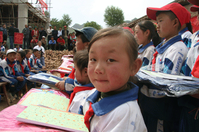 新东方“自强之旅”名师演讲团在结束舟曲一中的讲座后,6月1日上午,共青团甘肃省委、甘南藏族自治州州委、舟曲县委、县政府以及兰州新东方学校一行驱车50公里,奔赴舟曲县石家山新东方抗震希望小学,同灾区的400多名孩子一起度过了一个愉快的儿童节。