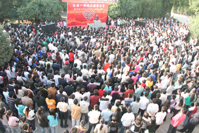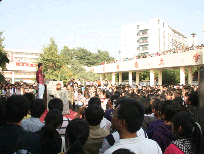 搭建极为简陋的讲台丝毫没有影响俞敏洪老师演讲的激情,神采飞扬依旧如故。红色休闲上衣、牛仔裤、运动鞋,出现在万千西北学子面前的俞老师青春四溢,激情澎湃!迎着同学们热烈的欢呼声,俞老师一个箭步跨上讲台。他以自己丰富的人生阅历鼓励同学们不要用自己的现状为自己一生下定论。俞老师有些自嘲自己当年大学时代的日子,诙谐搞笑轻松中不失深刻的人生反思。从大学时代的青春、青涩、自卑到创业时代的失败、再失败到终将成功,再到今后对未来的展望,俞敏洪老师诠释自己一路走来对于“成功”不同解读。