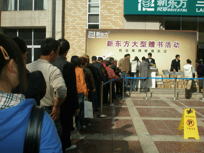 为了答谢兰州学子一年多以来对新东方的信任与支持,经过了长期的准备与宣传,我校于2009年10月18日在兰州新东方学校团省委教学区举行了盛大的赠书活动,得到了广大市民的积极响应,短短2小时的活动中近400多名市民踊跃参加,在明媚的阳光下现场的学习气氛十分浓郁。