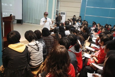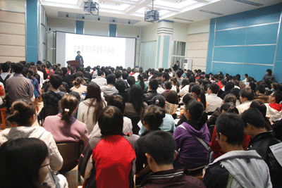 来自新东方教育科技集团前途出国留学咨询服务中心的易飞鹏老师以自己留学英国的经历介绍了赴英国留学的相关情况、英国各知名大学具体情况及各自的优势与特点,充满异域风情的实例让同学们对国外生活产生了无尽的向往。讲座结束时已是晚上10点,但是现场很多同学仍不愿离去,他们围着兰州新东方的老师询问各种关于四六级以及英语学习中遇到的问题,更是积极领取兰州新东方为大家准备的英语学习资料,其中 600本《新东方英语》和《新东方精神》被“抢”领一空。