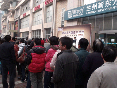 12月6日下午两点,兰州新东方学校在其团省委校区举行了盛大的公益赠书活动。 此次兰州新东方学校大型公益赠书活动内容丰富,其中包括新东方教育科技集团总裁俞敏洪著作的全英文版书籍《永不言败》、价值100元的新东方网络听课卡以及《新东方精神》杂志。活动还没开始,众多从四面八方赶来的大学生、初中生、小学生、学生家长、英语教师以及各行各业的上班族不顾寒风刺骨,已迫不及待的早早来到位于兰州市城关区民主西路400号的团省委校区前排好队,希望能尽早获得这些珍贵的礼物。