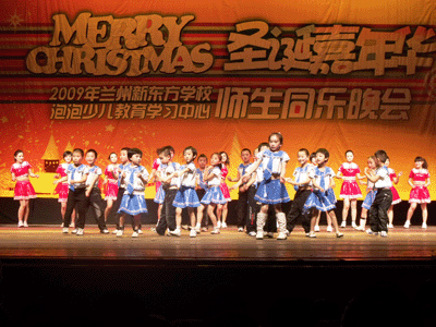 12月24日,兰州最华丽的剧院金城大剧院里热闹非凡,一千人的场地座无虚席,这是兰州新东方学校泡泡少儿教育学习中心全体师生共同组织的别开生面的2009年圣诞嘉年华师生同乐晚会现场。