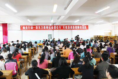 ——8月20日,“烛光行动—2009新东方教师社会责任行”活动,在甘肃省天祝藏族自治县职业教育中心盛大开幕。兰州新东方学校精心组织安排培训内容,初中班开设了阅读、完型、写作、语法、听力、口语、互动教学、英美文化概况、英语教学理论与实践等课程;小学班开设了小学英语教学创新设置、游戏教学法、课堂用语、积分方式及评价、集体备课、小组活动设计与实施、听说教学、体态语与手势、阅读、英语国家文化知识、语音、词汇、歌谣律动等课程,参加培训的170位学员都拿到了结业证书。这一知识惠民的举措,在当地被传为佳话。