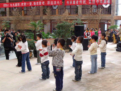 ——10月26日,兰州新东方学校鼎力协办的2009年度“大爱重阳,孝亲敬老”联谊大会,在位于兰州市城关区大沙坪的小山至善养老院隆重举行。小学员们在老师的带领下登上舞台,为在座的爷爷奶奶献上了他们精心准备的手语操《让爱传出去》、英文歌曲大连唱、以及儿歌,将最美的鲜花献给爷爷奶奶,有的小学员抱着爷爷奶奶不肯放手,有的小学员亲着爷爷奶奶的脸颊也久久不愿离去,此时此景感人至深。