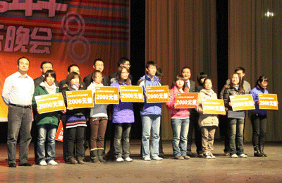 ——12月24日,金城大剧院里热闹非凡,座无虚席。兰州新东方学校“2009年圣诞嘉年华师生同乐晚会”隆重举行。晚会现场除精彩纷呈的文艺节目外,抽奖环节更是惊喜连连。自行车、青花瓷等奖品让现场观众开心不已。兰州新东方学校校长孔建龙,为广大观众抽取了一等奖——笔记本电脑。接着,他为兰州商学院10名贫困大学生捐赠了共计20000元的奖学金,鼓励他们在人生逆境中,能健康、勇敢、勤奋,为梦想拼搏!新东方再次用爱诠释了企业责任!
