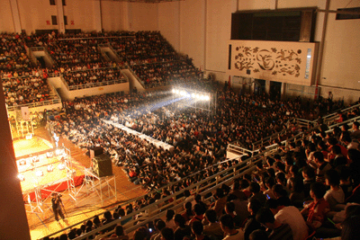 ——2009年9月21日晚,由共青团甘肃省委、读者出版集团、新东方教育科技集团、新浪网主办的“读者·新东方美文朗诵激情演讲之夜”首站活动,在兰州盛大举行。气势恢宏的西北师范大学体育馆装点一新。来自西北师范大学、兰州交通大学、兰州大学、西北民族大学等高校的6000余名学子的激情,被撼人心魄的美文和悠扬激越的旋律点燃。他们的心灵得到净化,理想得以升华。副市长周丽宁、新东方教育科技集团董事长兼首席执行官俞敏洪、《读者》杂志社编委会主任彭长城等出席并登台朗诵,把活动推向了高潮。