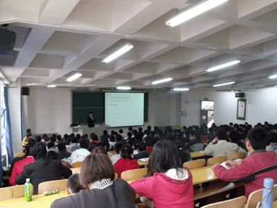 下午三点还未到,同学们就早早来到教室占座位。不一会儿,能容纳380人的教室座位全部坐满。三点整,在同学们的期待中,讲座开始了。