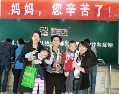 在活动的现场有两位年轻的姐妹母亲是和她们的妈妈一起来接孩子的,见此情景,工作人员为两位“年轻妈妈”和她们的“老妈妈”送上了祝福的鲜花,拿着鲜花的三位妈妈高兴地感叹道:“真是没想到来接孩子还能得到如此的惊喜,新东方想的真是太周到了,这个母亲节我们真的很开心!”说到这儿,三位妈妈高兴地和他们的孩子一起在“妈妈,您辛苦了”的横幅下合影留念,共同记录下了这难忘的节日。
