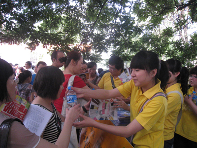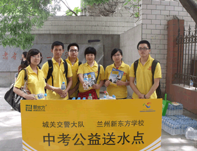 6月16日,兰州市2010年中考如期举行。城关交警大队携手兰州新东方学校,共同开展了“中考送水公益活动”,向烈日炎炎下参加考试的考生和辛苦陪考的家长,免费赠送纯净水。
