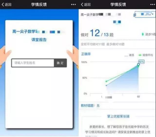 学生家长通过扫描二维码当天即可查询学生当天正确率及其排名,完全实现家校一体化,共同见证孩子的进步。家长们还可以登陆我们的掌上优能客户端,实时了解孩子在上课中的学习动态和学习情况。